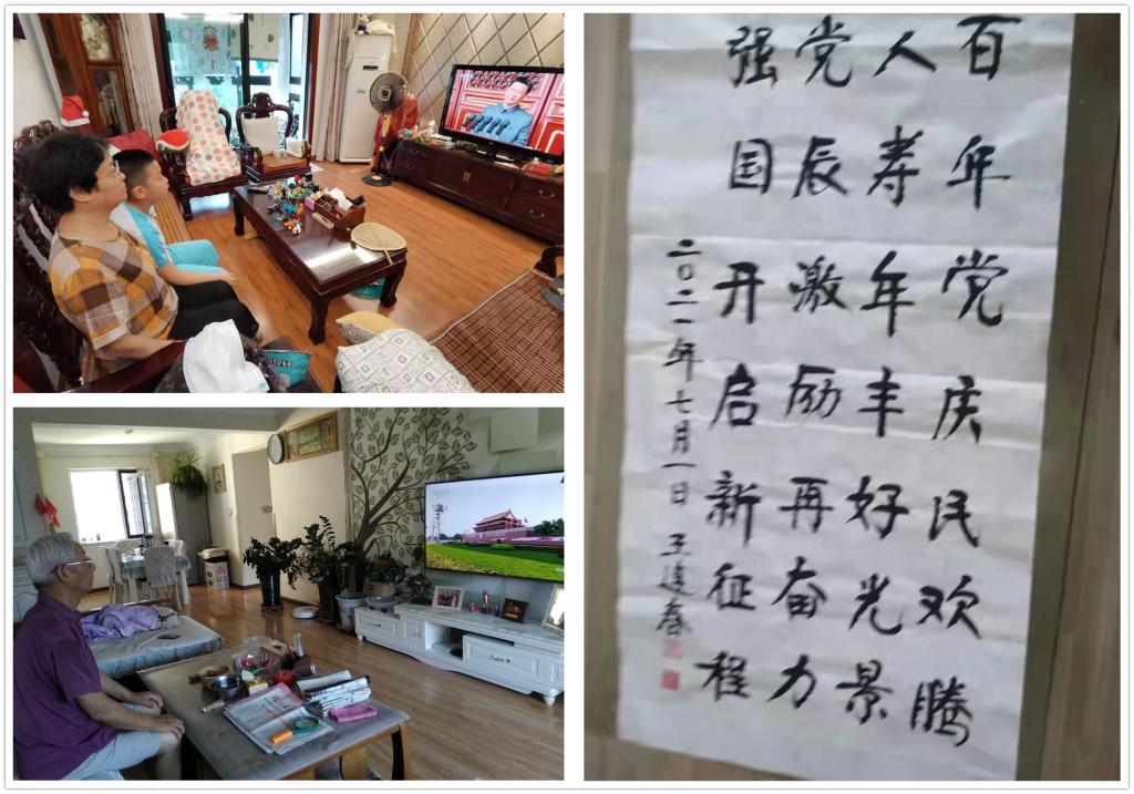 老党员牛永祥说:“我的心情久久不能平静!总书记的建党100周年讲话是团结振奋的话,振奋国威的讲话!是建设社会主义现代化强国,实现中华民族伟大复兴的冲锋号!讲出了我们坚定信念,使我们更加坚定地永远听党的话!永远跟着共产党走!为实现新时代的中国梦努力奋斗”!老党员罗淑惠激动地说:“百年苦难辉煌,百年风雨兼程。理想信念之火一经点燃,就永远不会熄灭。总书记的重要讲话很振奋,我加入中国共产党己经有48周年,在党的教育和培养下使自己不断茁壮成长,如今快到古来稀的年龄,我将紧紧围绕着以习近平同志为核心的党中央和中国共产党周围,坚定信心,牢记使命,永远听党话、跟党走,奔向伟大新征程!”老党员们心潮澎湃,纷纷赋诗写联礼赞伟大的党、伟大的时代。杨继立赋联:百年征程,改天换地,神州已崛起;千秋伟业,强国富民,华夏定复兴。张小军做诗一首:建党百年多坎坷,跟党前行不退缩,砥砺奋斗需努力,下个百年齐欢歌!苏伟宁写到:东边日出光遍地,北国雪化霞满天,中共沧桑一百年,盛世华诞喜空前!