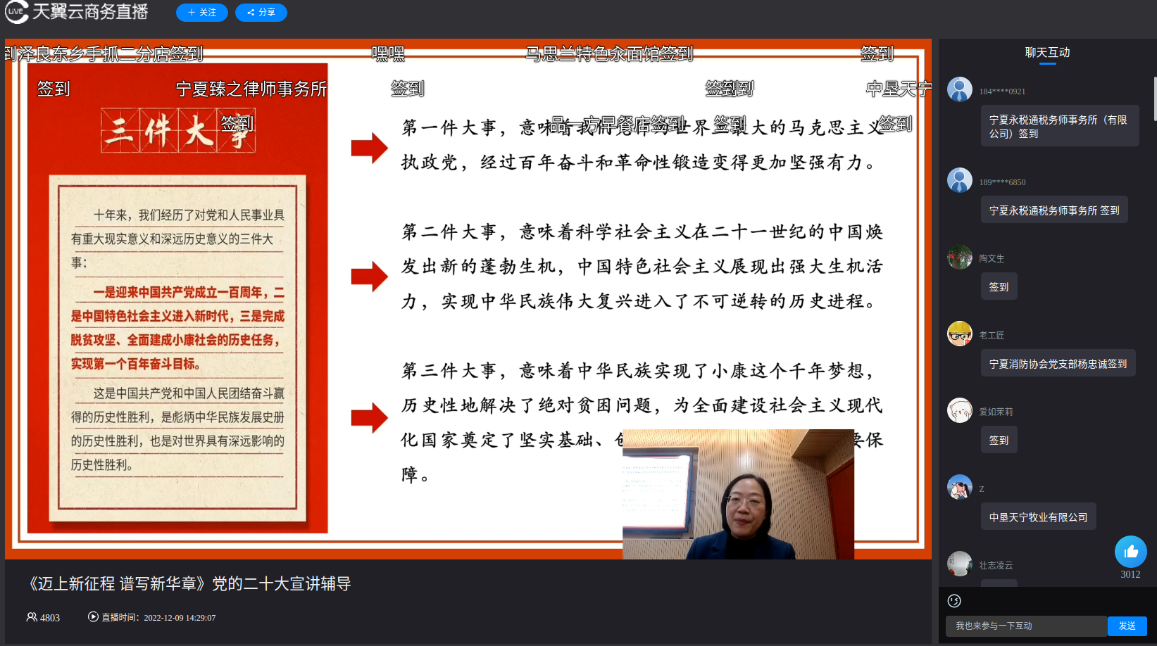 为全面学习宣传贯彻党的二十大精神,深入学习贯彻习近平新时代中国特色社会主义思想,扎实开展党的二十大和习近平总书记视察宁夏重要讲话指示批示精神“大学习、大讨论、大宣传、大实践”活动,更加深刻领会和准确把握党的二十大新要求、新目标、新部署,2022年12月9日,在自治区非公经济组织和社会组织工委的统筹部署下,熟女丝袜 社会组织党委邀请自治区党校科研处处长、教授、法学博士王琼为我区各社会组织团体和广大非公企业通过线上直播形式进行《迈上新征程 谱写新华章——学习党的二十大报告,领会党的二十大精神》专题辅导,13家全区性非公企业和社会组织行业(综合)党委及非公企业约7800余人在线进行了学习。