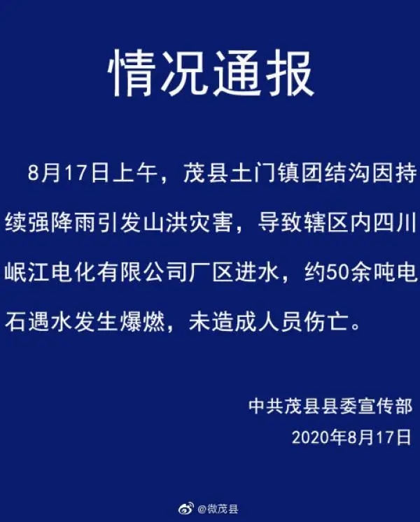 2020年8月17日下午,四川阿坝州茂县县委宣传部官方微博发布情况通报称,茂县土门镇四川岷江电化有限公司因山洪进水,50余吨电石遇水发生爆燃,幸未造成人员伤亡。
