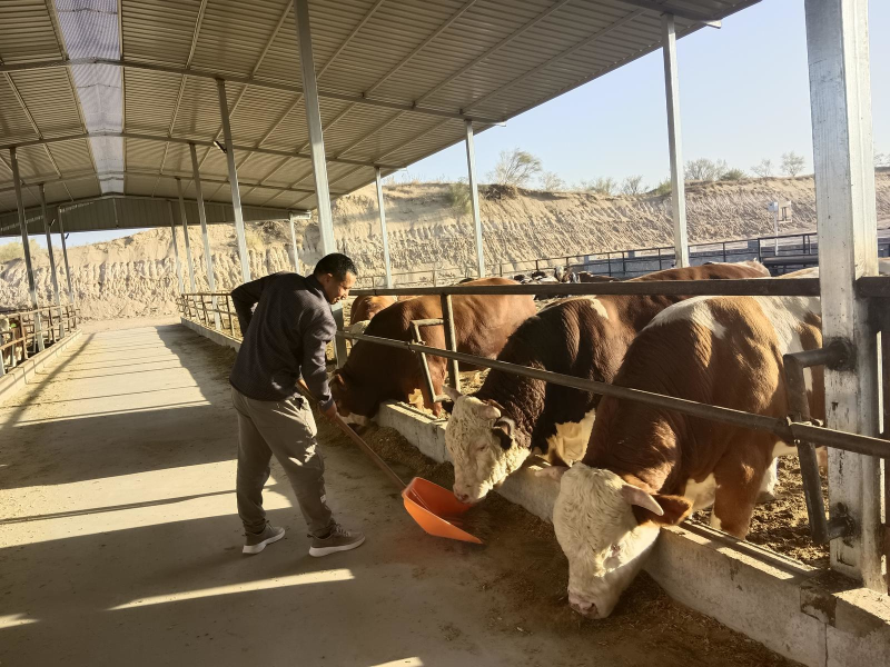 马生华在村集体牧场给牛添放饲料。