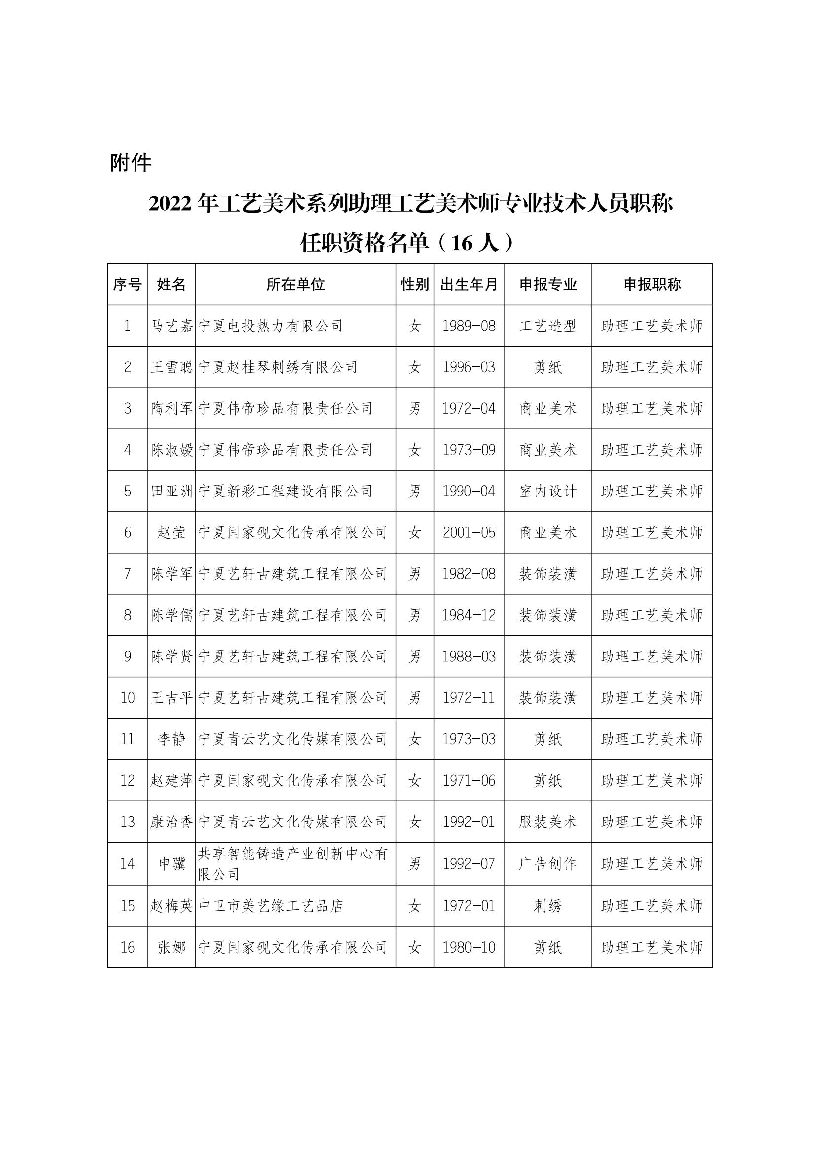 附件:2022年工艺美术系列助理工艺美术师专业技术人员职称任职资格名单(16人)