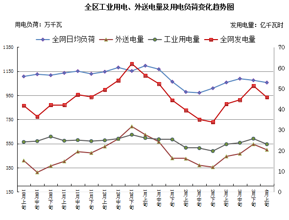 发用电信息:本旬,全网发电量45.7亿千瓦时,环比增长下降11%(环比少一天),同比增长30.2%;工业用电量23亿千瓦时,环比下降10.7%,同比下降0.9%;外送电量20.3亿千瓦时,环比下降11.5%,同比增长113.7%;全网日均用电负荷1056万千瓦,环比下降1.7%,同比降0.9%。