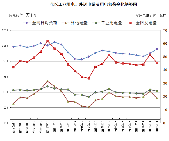 发用电信息:本旬,全网发电量45.17亿千瓦时,环比下降12.6%(环比少一天),同比增长12.6%;工业用电量24.06亿千瓦时,环比下降4.41%,同比下降0.11%;外送电量18.61亿千瓦时,环比下降22.1%,同比增长37.55%;全网日均用电负荷1107万千瓦,环比增长5.17%,同比下降0.1%。