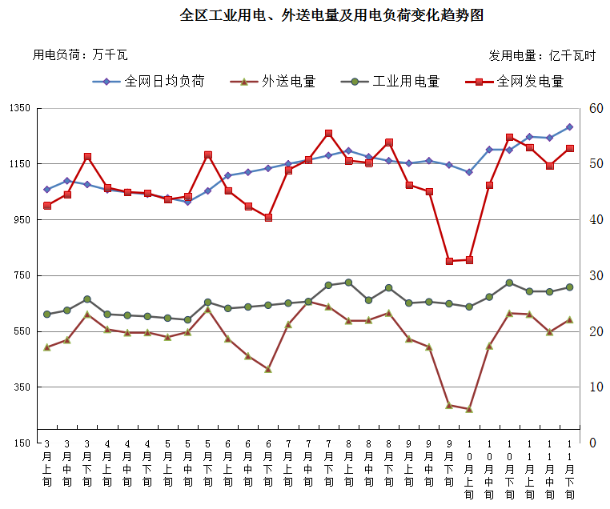 发用电信息:本旬,全网发电量52.77亿千瓦时,环比下降6.31%,同比增长15.1%;工业用电量27.85亿千瓦时,环比增长3.11%,同比增长13.5%;外送电量22.04亿千瓦时,环比增长11.12%,同比增长17.4%;全网日均用电负荷1281万千瓦,环比增长3.1%,同比增长13.5%。