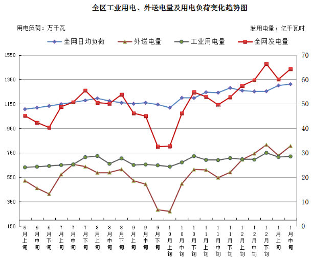 发用电信息:本旬,全网发电量64.3亿千瓦时,环比增长7.04%,同比增长23.04%;工业用电量28.52亿千瓦时,环比增长0.86%,同比增长12.38%;外送电量32.82亿千瓦时,环比增长13.72%,同比增长35.32%;全网日均用电负荷1312万千瓦,环比增长0.86%,同比增长12.38%。